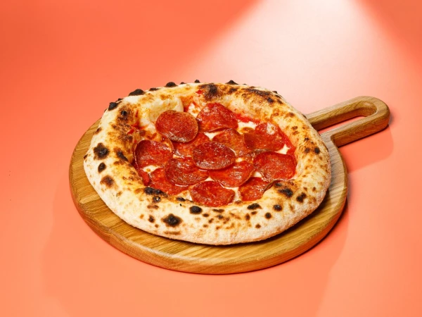 Пицца с гармоничным сочетанием разнообразных ингредиентов. В составе грибы, салями, пепперони, перец и оливки. Присутствуют традиционная моцарелла и томатный соус.